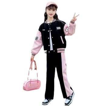 مجموعة فساتين رياضية غير رسمية للبنات معطف بيسبول للربيع/الخريف مع تنورة مطوي ملابس مراهقة من قطعتين للأطفال
