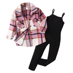 المصنع مباشرة مجموعة ملابس مريحة فتاة بلون واحد قطن حمالة بذلة مع قميص منقوش جاكيت نمط عارضة