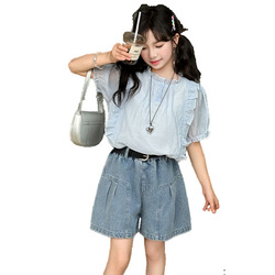 New Arrival Girls Fashion Summer Clothes Two-piece Set Big Kids Boutique Clothing Bubble Sleeve Denim Top + Skirt Outfit