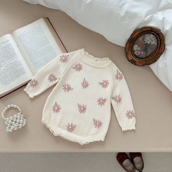 Logotipo personalizado Etiqueta Outono Inverno Quente Manga Longa Bordado Floral Algodão Bebê Infantil Meninas Malha Macacões Macacão Camisola