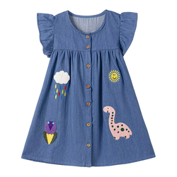 Estilo americano europeu Verão Casual Mid-Calf Meninas Manga Curta Denim Saia Botão Patch Bordado Design Dos Desenhos Animados